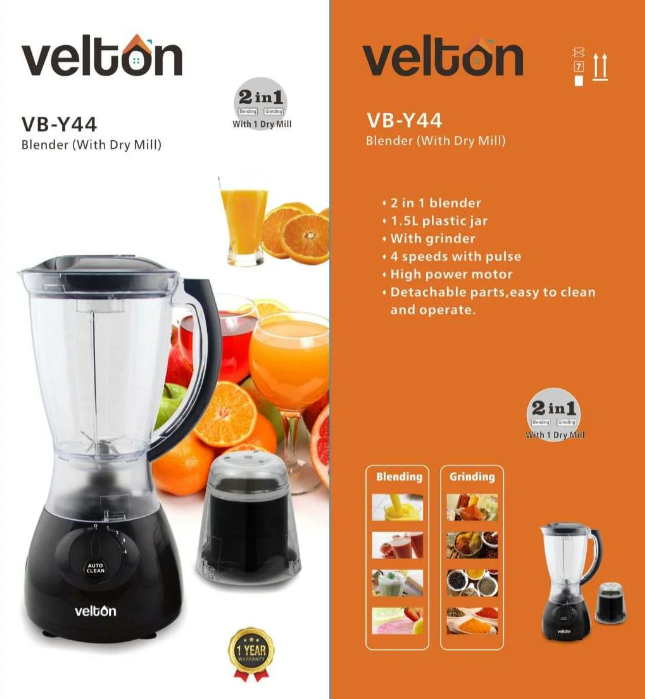 Whether you’re a cooking enthusiast or simply want to prepare quick and healthy meals, the Velton 2-in-1 Blender is an essential tool for blending fruits, crushing ice, making sauces, and grinding spices with minimal effort. Its ergonomic design, combined with durable parts and ease of use, make it a reliable and convenient option for every household.